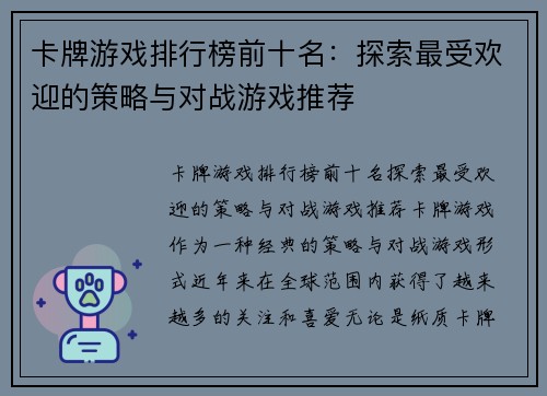 卡牌游戏排行榜前十名:探索最受欢迎的策略与对战游戏推荐